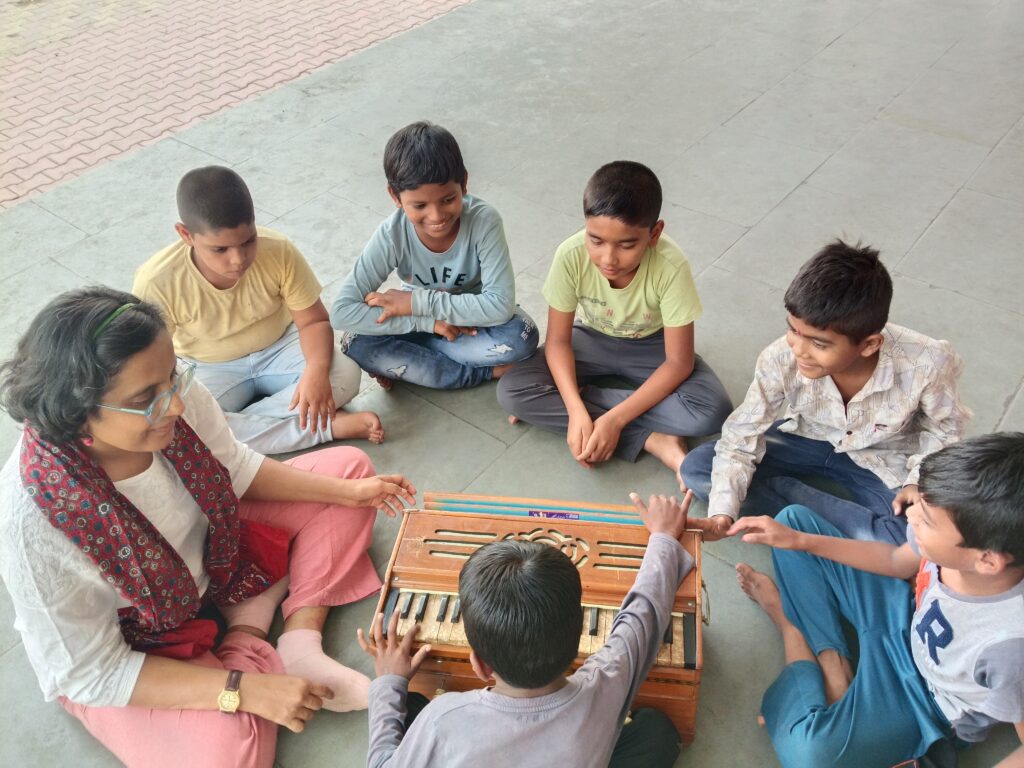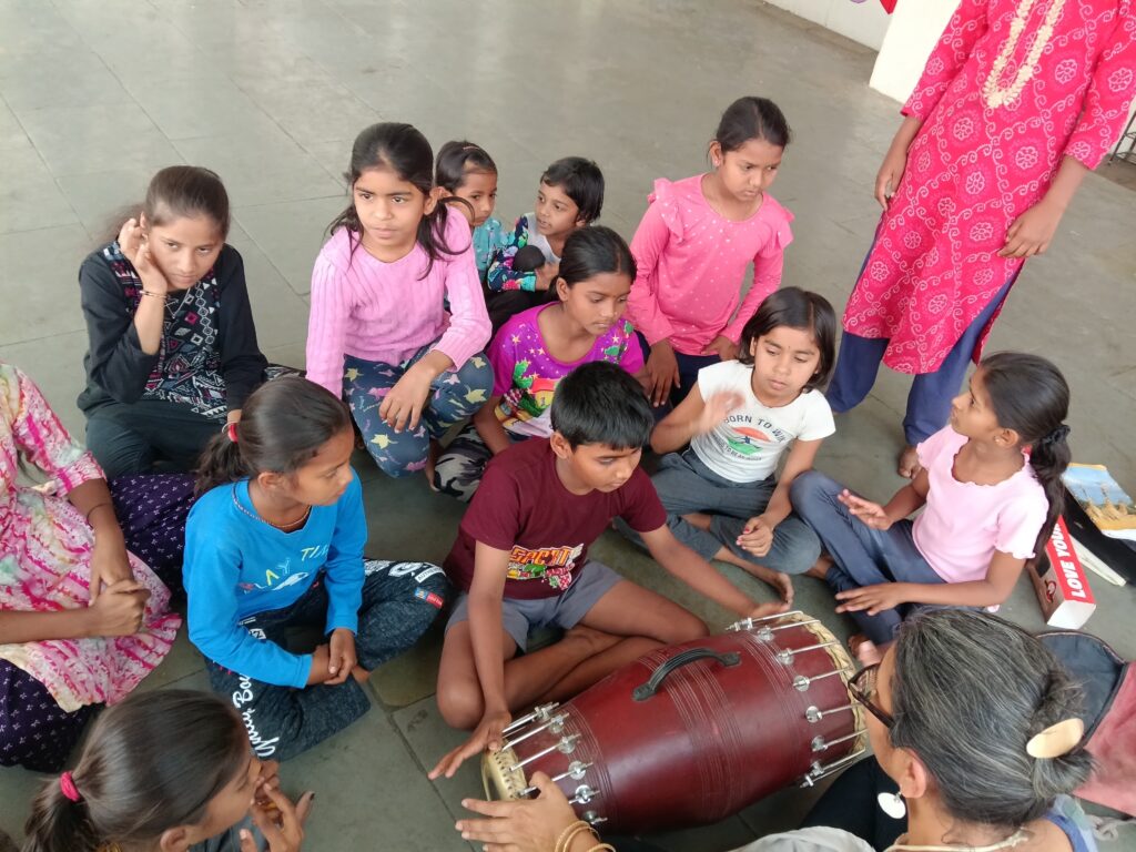 Learning to focus, to listen, to recognize and filter sound..the kids also played with a harmonium and dholak that we carried for them.