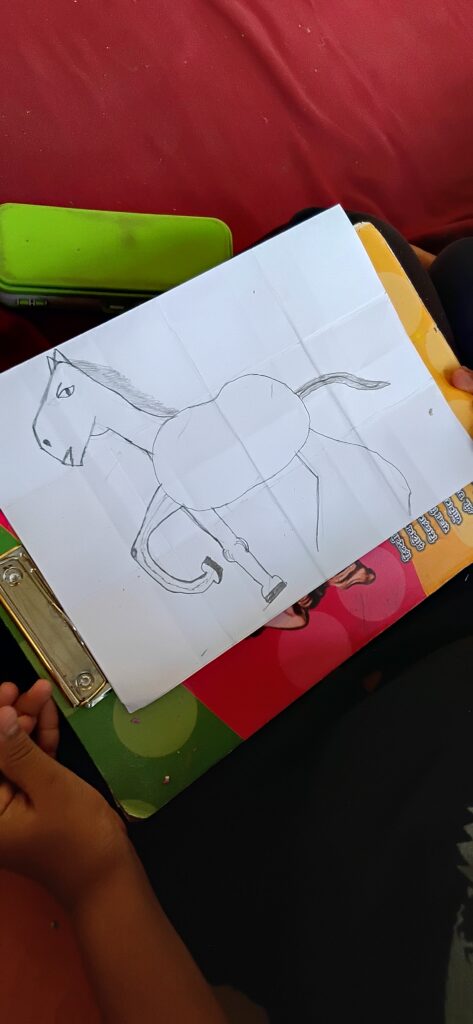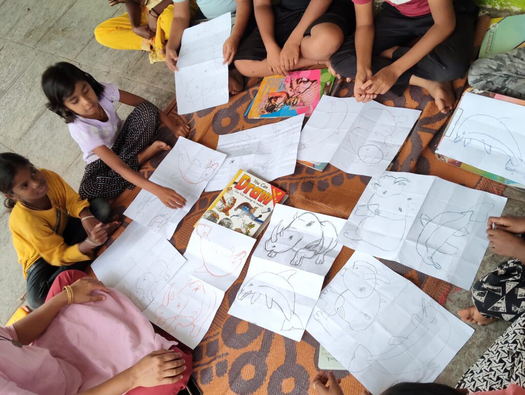 Drawing allows for visual cognition to develop among children teaching them to observe carefully and remember more clearly. Periodically, drawing activities are offerred as a way to include slow learners or those who find text challenging. Drawing with grids and structure enables them to develop visual analytical skills as well.