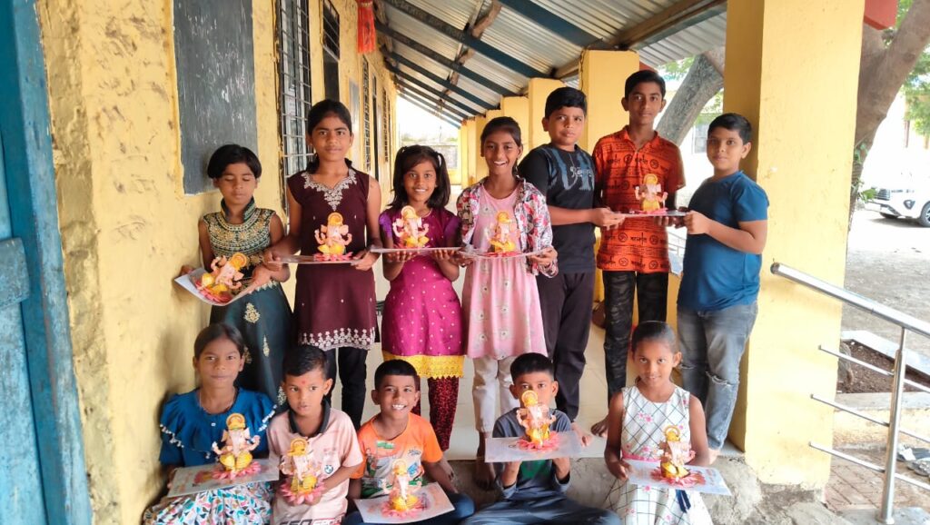 Handicraft offers a way for children to learn to use their hands creatively and become productive. The children did a DIY session on making paper Ganesh idols prior to the Ganesh Chaturthi festival. As they worked with assembling the paper cut outs, they were also told about the problems caused by the immersion of POP idols into natural water bodies.